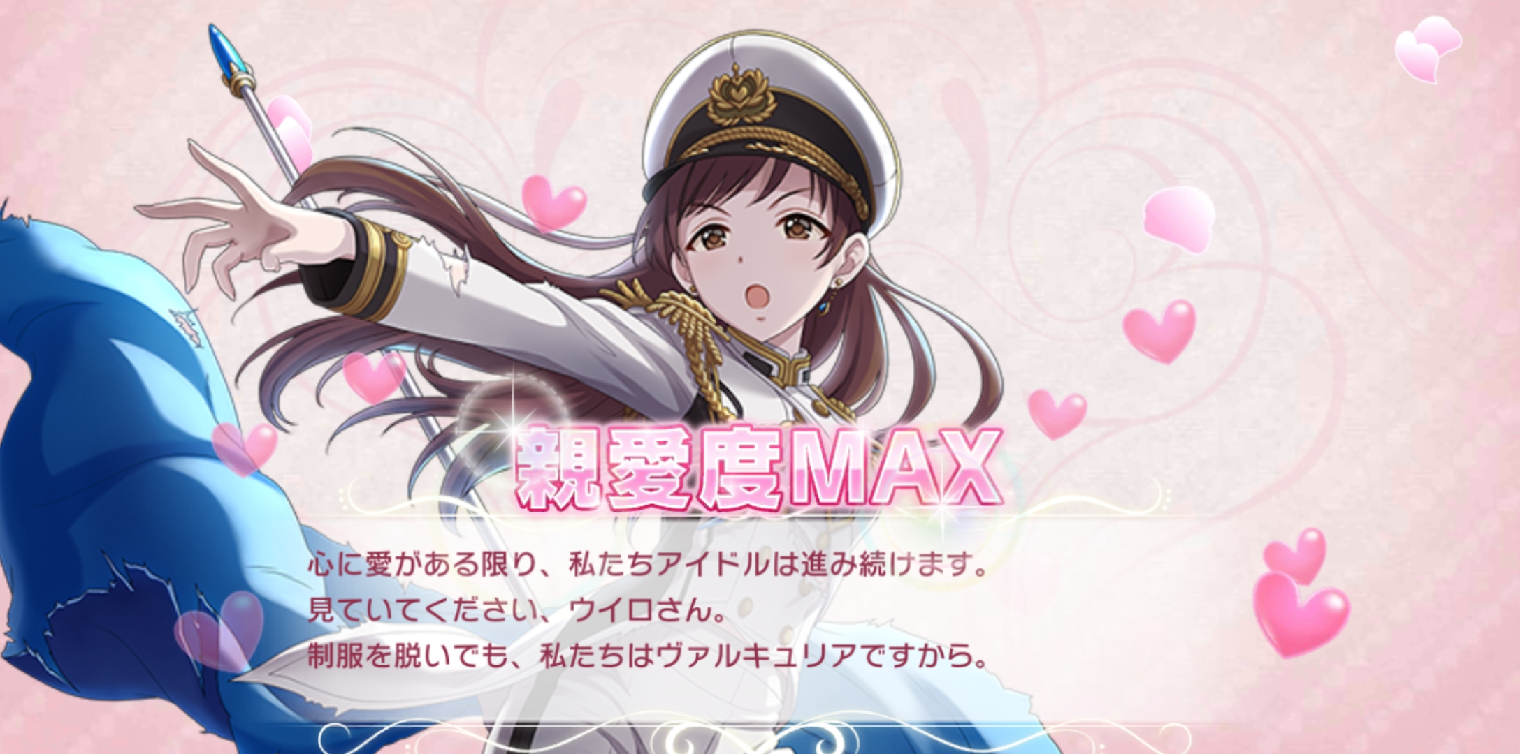 - 마음에 사랑이 있는 한, 우리 아이돌은 나아갈거에요. 지켜봐 주세요, 프로듀서 씨. 제복을 벗어도, 우리들은 발큐리아니까요.