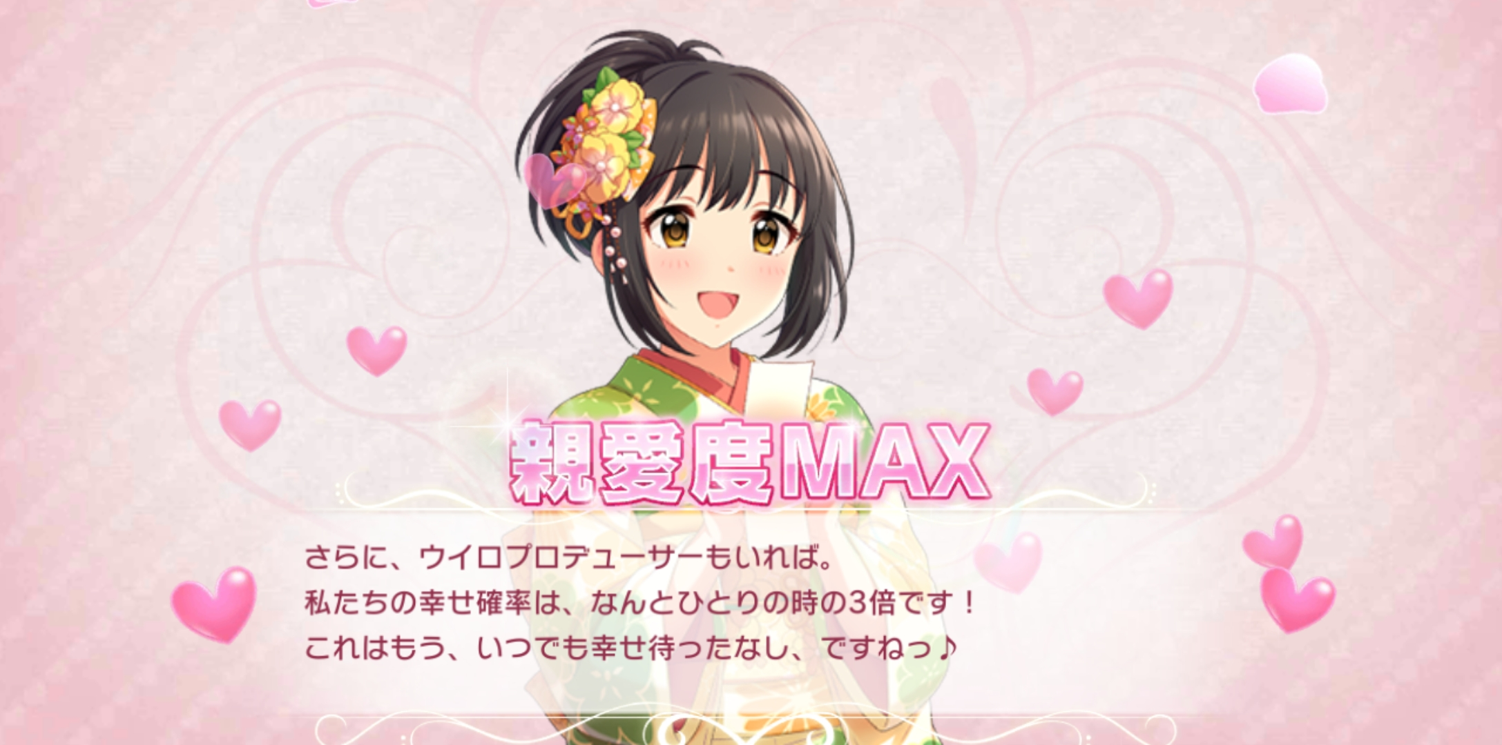 - 게다가, 프로듀서도 있고. 저희의 행복해질 확률은, 무려 혼자일 때 보다 3배에요! 이건 정말, 빼도 박도 못할 행복 확정, 이네요♪