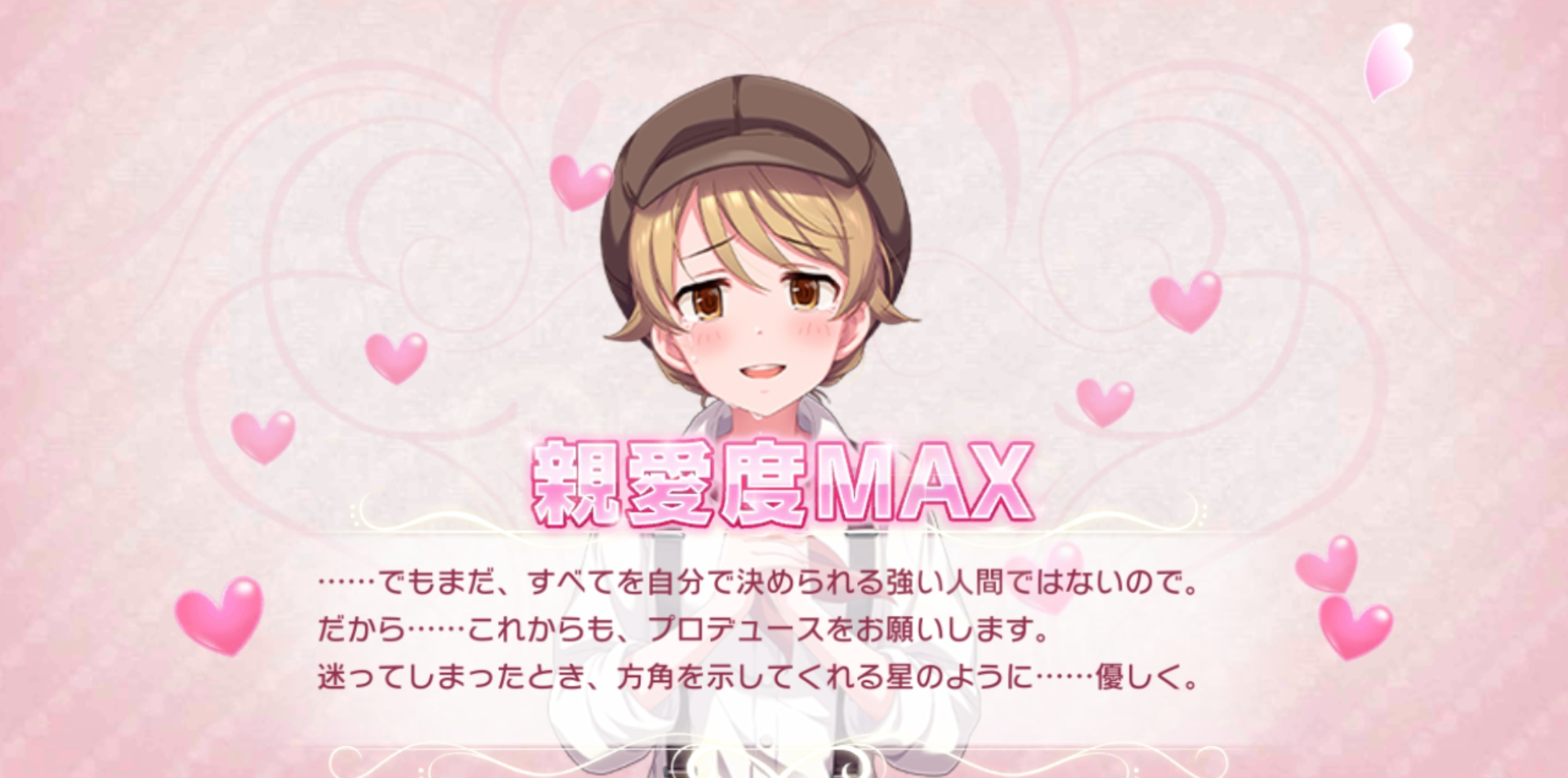 - ...하지만 아직, 모든 것을 스스로 정할 수 있는 강한 인간은 아니라서. 그러니까... 앞으로도, 프로듀스 부탁드려요. 길을 잃었을 때, 방향을 가리켜주는 별처럼... 상냥하게.