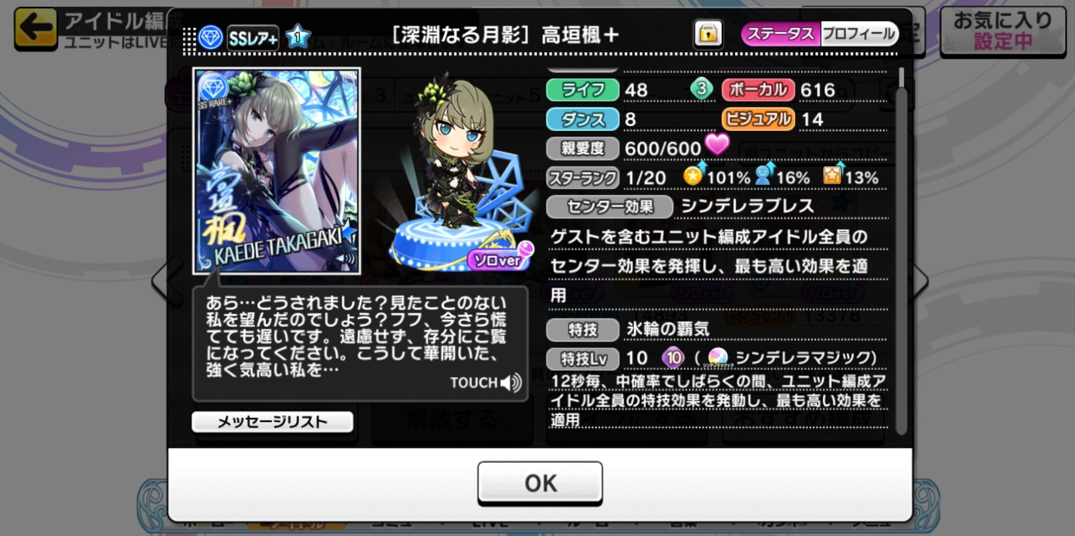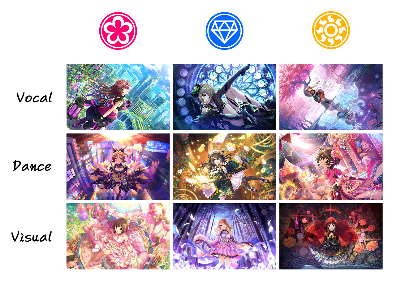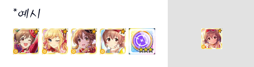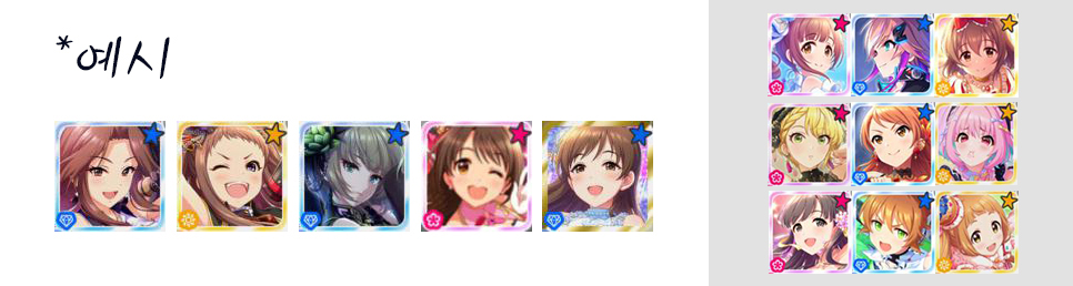 - 튜닝(같은 주기) + 튜닝(같은 주기) + 신데렐라 매직(센터) + 스킬부스트 + 판정강화(SSR) + 레조넌스(게스트)