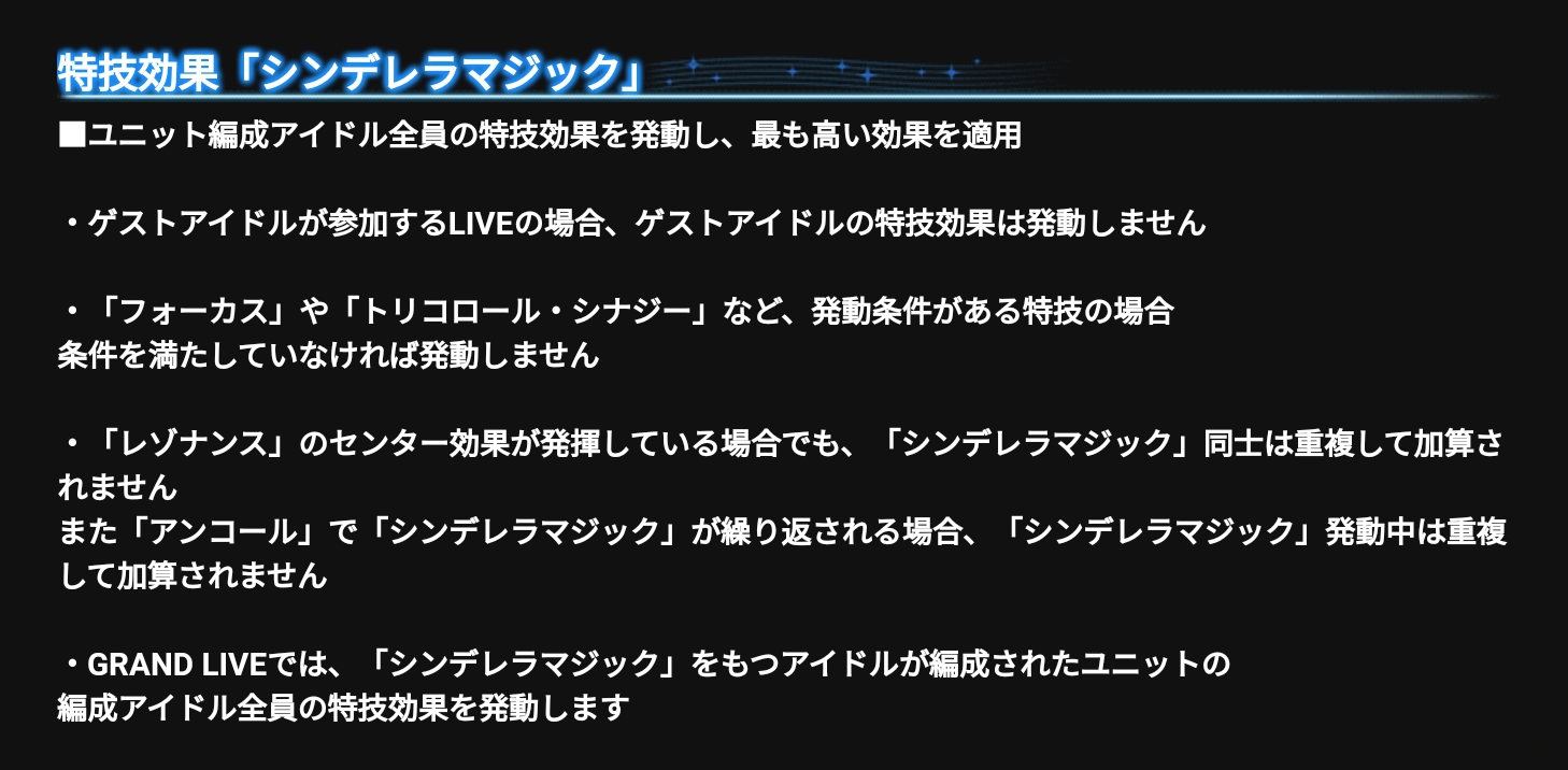 *각 특기에서 가장 높은 수치만 적용, 신데렐라 매직끼리는 발동되지 않는다.