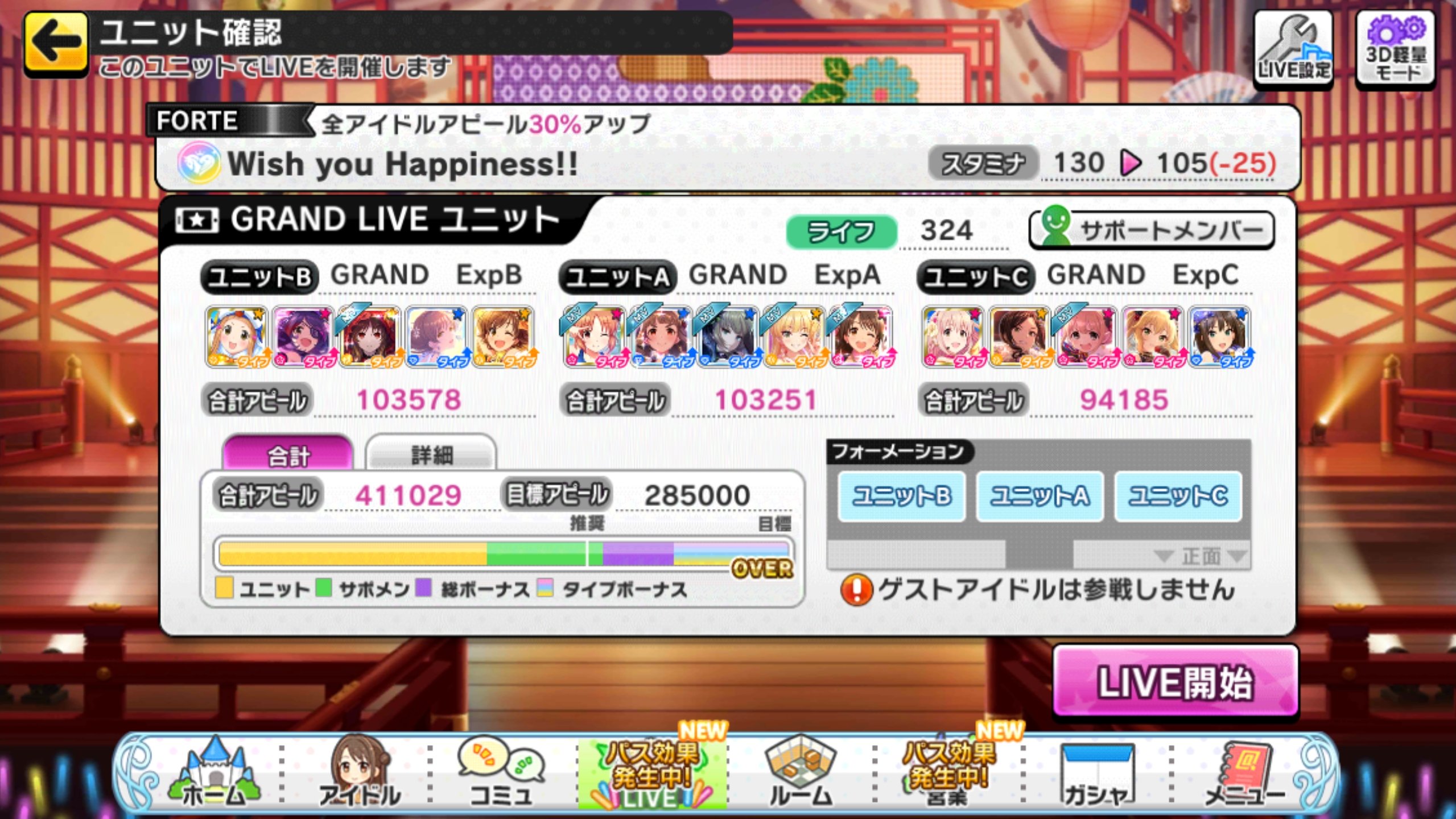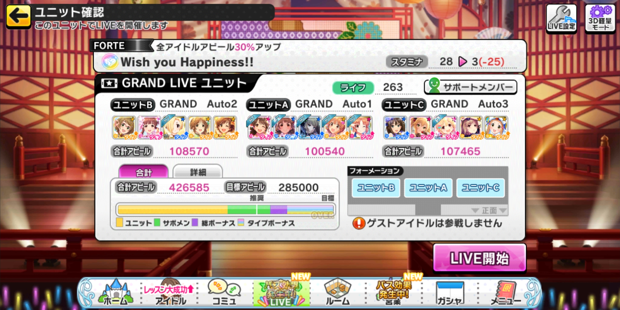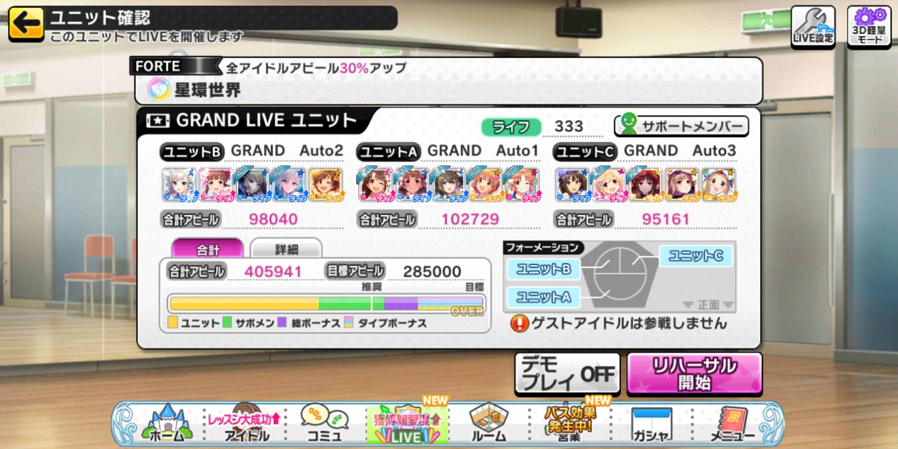 - 유닛C - 판정강화 + 트리콜로르 심포니 + 신데렐라 매직(센터) + 데미지 가드(9초) + 자유편성