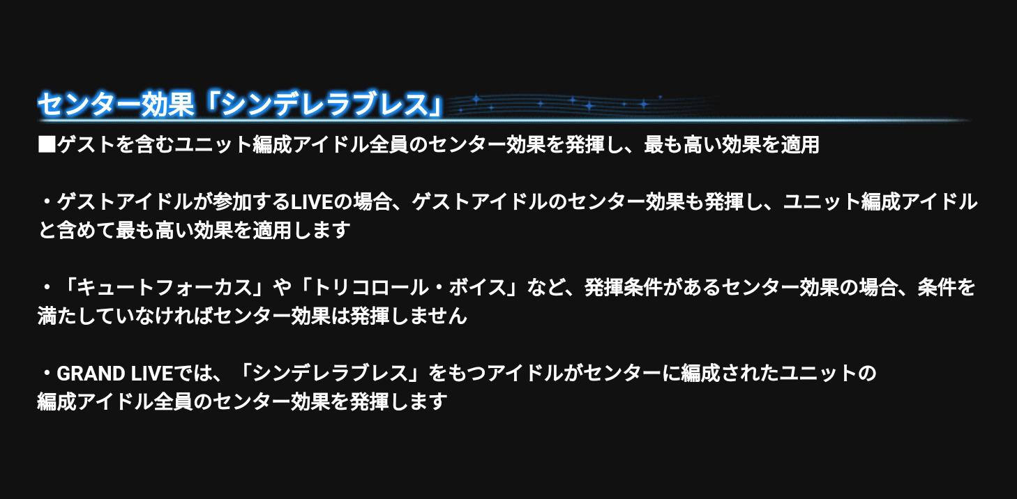 *센터스킬은 같은 효과의 중복이 불가능. 게스트와 편성에서의 중복도 마찬가지